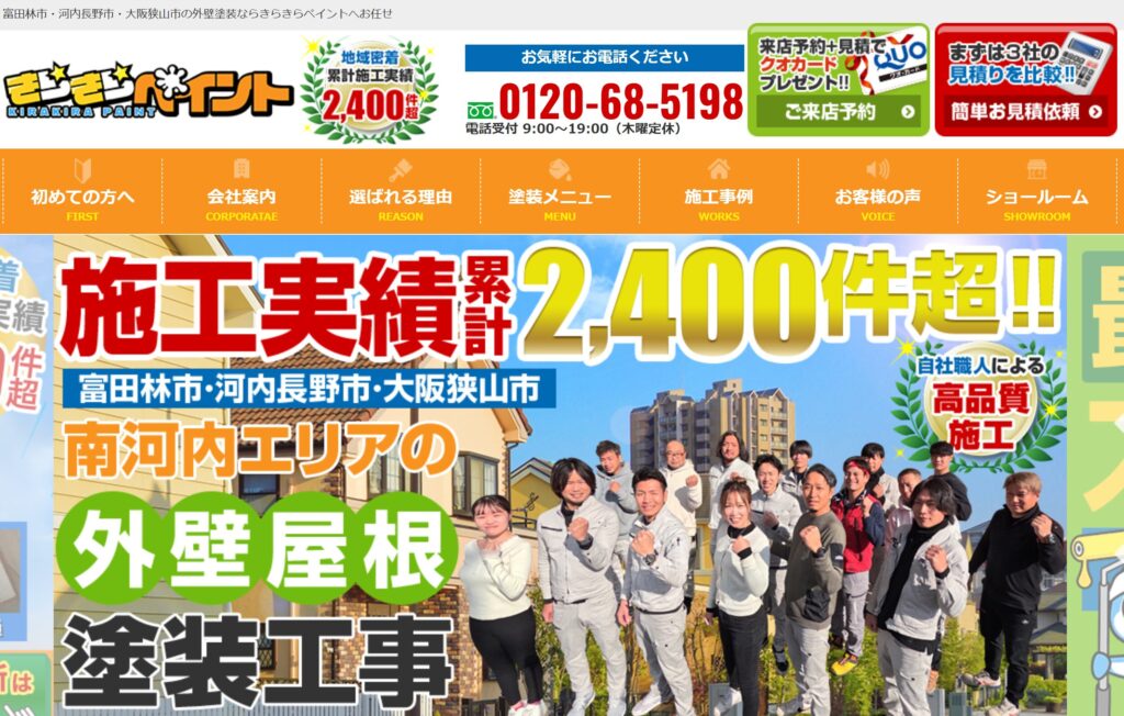 きらきらペイント」は、大阪府南河内エリア(富田林市・河内長野市・大阪狭山市をはじめ近隣地域)を中心に展開する 外壁・屋根塗装の専門店 です。累計2,400件以上の豊富な施工実績を持ち、熟練の自社職人による丁寧な手塗り仕上げと、わかりやすい診断書・見積書の提示で安心・高品質な塗装サービスを提供しています。外壁・屋根塗装の各種プランやカラーシミュレーションが選べ、ショールームで専門スタッフが詳しく相談にも対応。無料見積もり・診断も受け付けており、初めての塗装でも安心して依頼できる地域密着型のサービスです。